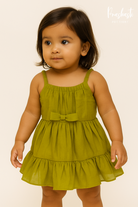 Chic, charming, and super comfy – this Mehndi Green Frock from Prashasti Boutique is designed for your little fashion icon. Featuring soft gathers, a cute bow at the waist, and a flared ruffle hem, this frock blends traditional color with modern style. Perfect for festive gatherings, birthday parties, or a casual day out!